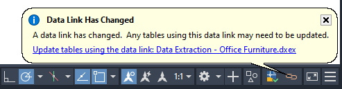Tip: When at least one table in a drawing contains extracted data, the Data Links icon is displayed in the system tray of the AutoCAD application window. While the icon is displayed, you can right-click the icon to manage and update the data links in a drawing. The DATALINKNOTIFY system variable controls the appearance and functionality of the Data Links icon.