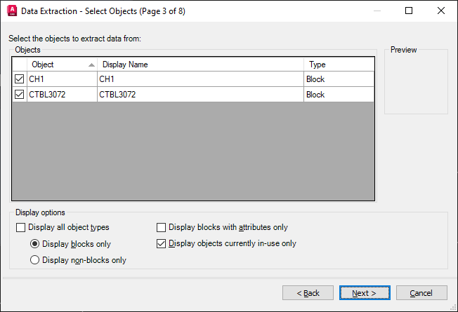 - Clear the Display All Object Types checkbox and choose Display Blocks Only, and click Next to continue.