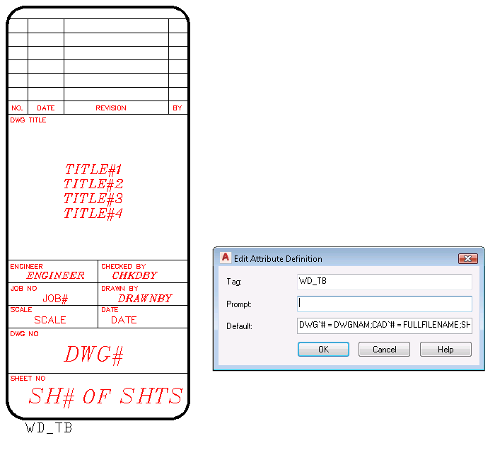 An invisible attribute on a title block of the drawing, named "WD_TB," is encoded with the mapping information. This method eliminates the need for an external mapping text file. The format is <attribute name>=<LINEx>;<attribute name>=<LINEx>. Here is an example of what the WD_TB attribute value would be: