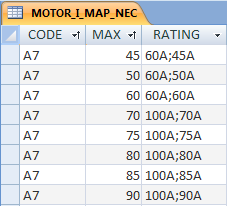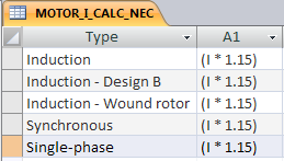Such an automatic calculation can be accomplished by creating a relationship between the call in the ANNOTATE_LIST field value in the circuit codes sheet of the circuit builder spreadsheet, and the MOTOR_I_* tables in the electrical standards database.
