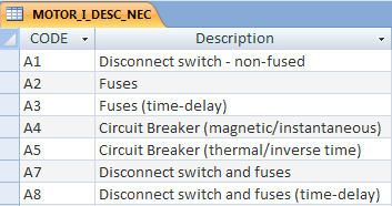 In this example, “A1” is the code to match in the MOTOR_I_DESC table (for “Disconnect switch non-fused”), and “RATING1” is the attribute on the inserted disconnect switch symbol to receive the final calculated amp value.