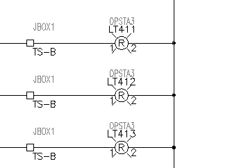 LT411 and LT413 are assigned an Allen-Bradley part number for a 30-mm pilot light (catalog part number 800H-PR16R). LT412 is given a part number for a smaller, 22.5-mm pilot light (catalog part number 800MR-P16RS). The manufacturer and catalog part number assignments are carried on invisible attributes MFG and CAT on each instance of the red pilot light symbol. All three symbols look the same on the schematic since they are the same AutoCAD block symbol. The difference is the assigned part number attribute values that each carries.