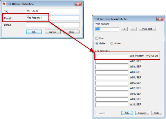 The horizontal and vertical wire number blocks must have a WIRENO attribute. The blocks can also have W01USER-W10USER attributes which can be used to assign various properties to the wire. If you define prompt values for any of the W01USER-W10USER attributes on the wire number block, the prompts are included in the label when you edit the wire number to assign values.