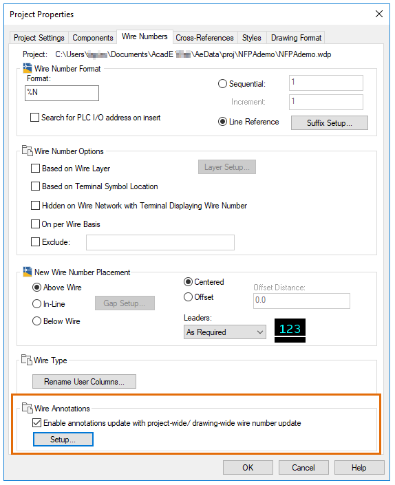 Under Wire Annotations section, select the checkbox to enable annotations update with project-wide or drawing-wide wire number update.