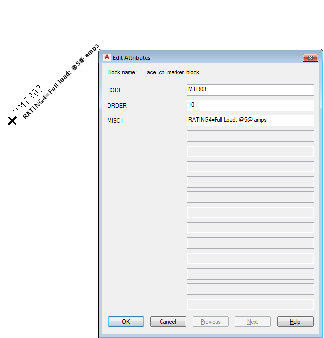 The values generated by this motor setup/annotation function are not automatically written to attributes on the components or wire types on the circuit. These values are saved as an indexed list in an AutoLISP global variable called “#data”. Global means that the data is saved in memory and is available while the Circuit Builder continues to construct the circuit. As Circuit Builder processes subsequent marker blocks of the circuit, it can be set up to pull one or more of these saved values from the global and push them out to attributes on the components or used to format appropriate wiretype layer names