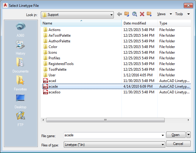 In the Select Linetype File dialog box, select acade.lin and click Open.