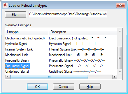 In the Load or Reload Linetypes dialog box, select Pneumatic Signal and click OK.