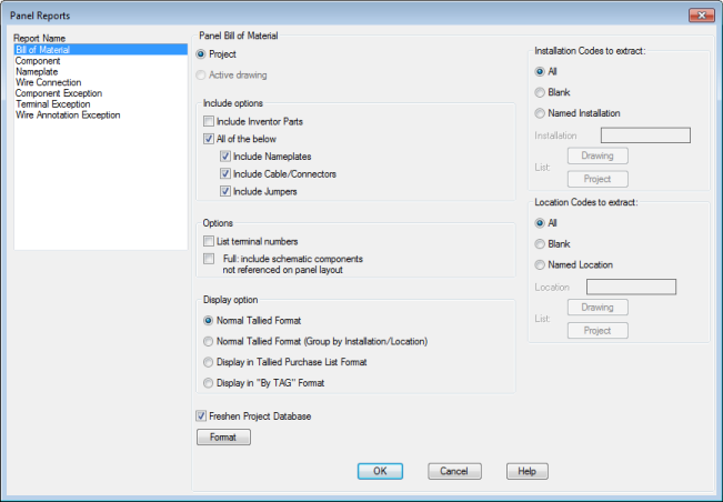 Specify whether to process the project, the active drawing, or selected objects. If project is selected, some reports provide an option to select which drawings to process.