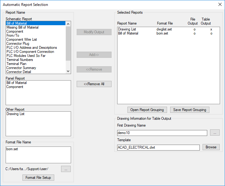 Select the report name and a format file (.set) for each report you want to run. The format files should define either file output, table output, or both.