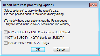 Each report type has an associated lisp file (.lsp) and dialog box definition file (.dcl) that can be customized to post-process the report data. When you run a report, the data is displayed in the Report Generator dialog box. If you click User Post, the dialog box defined in the associated .dcl file displays. The actual processing for each option on the dialog box is defined in the associated .lsp file.