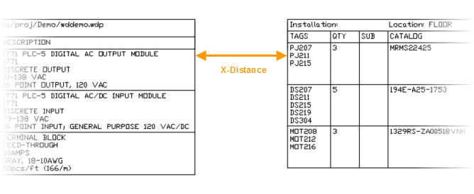 The X-distance and Y-distance values define the distance from the end of one table section to the beginning of the next. It is used when multiple table sections for one report are on the same drawing. A blank value is interpreted as zero.