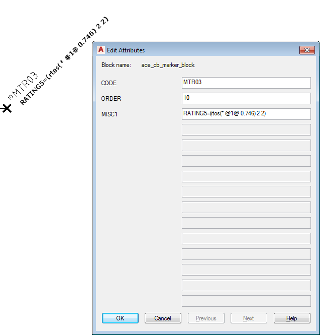 - Edit its MISC1 attribute value using the format “{attribute name}=(AutoLISP expression). For example, convert the HP value to Kilowatts and push this value out to attribute RATING5 on the motor symbol. Enter this expression on the MISC1 attribute of the marker block: