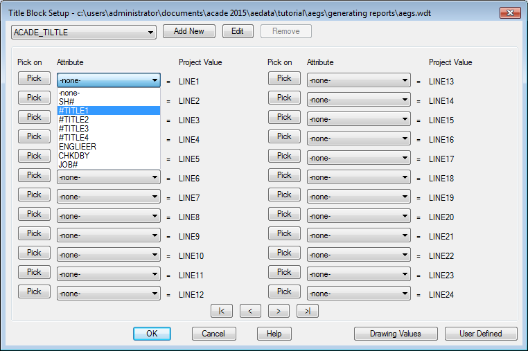 Note: Title Block Setup, WDT file method, can also be used on a drawing with the title block inserted as a block.