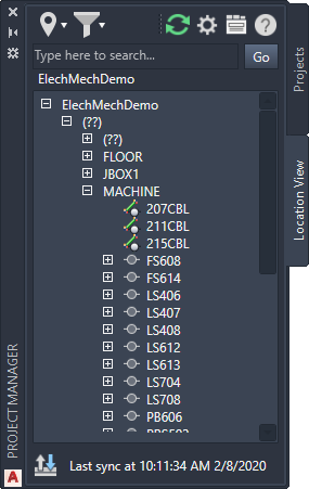 The various device types are represented differently in the component tree. When inserting electrical components, it is recommended that you should have unique names (installation code, location code, and component tag), pins, and terminals numbers. For example, if you have cable markers in your drawing, which has duplicate values for cable tag, then you may experience unexpected behaviour of the component in the component tree view and in the connections tab. This is more commonly observed for terminals and cable markers in Location View.