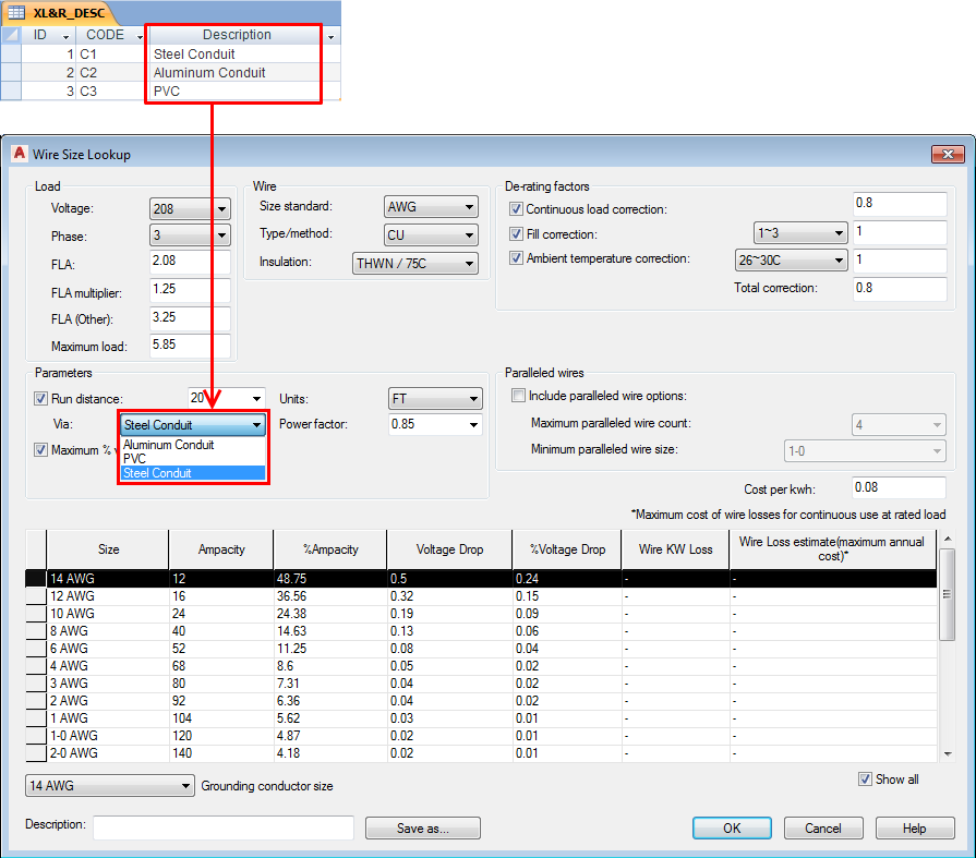 The description table, XL&R_DESC, contains the labels used on the Wire Size Lookup dialog box for the conduit or raceway type selection list. The labels also map to the columns in the data tables.