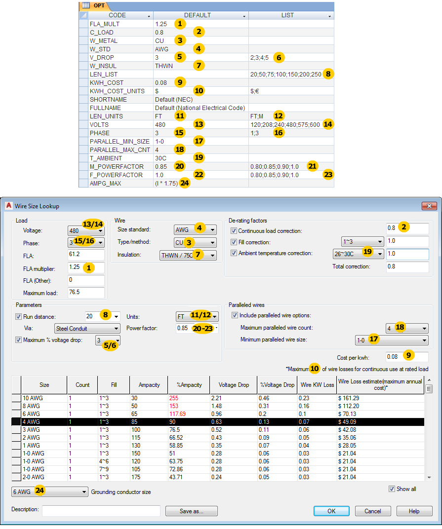 Options tables contain values defining defaults and options lists specific to an electrical standard. For example, default to copper wiring, AWG size standard, and feet for conductor length units.