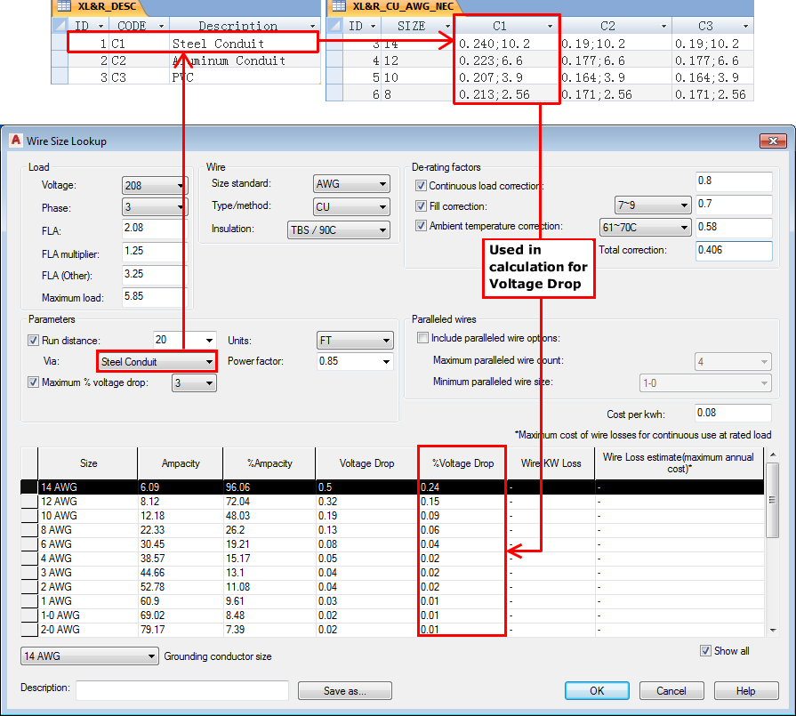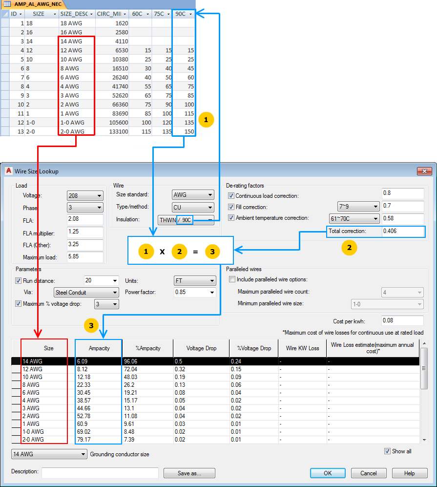 For example, a table named AMP_CU_AWG_NEC contains the wire ampacity information for copper, AWG sizes, and parallels what is found in the National Electrical Code.