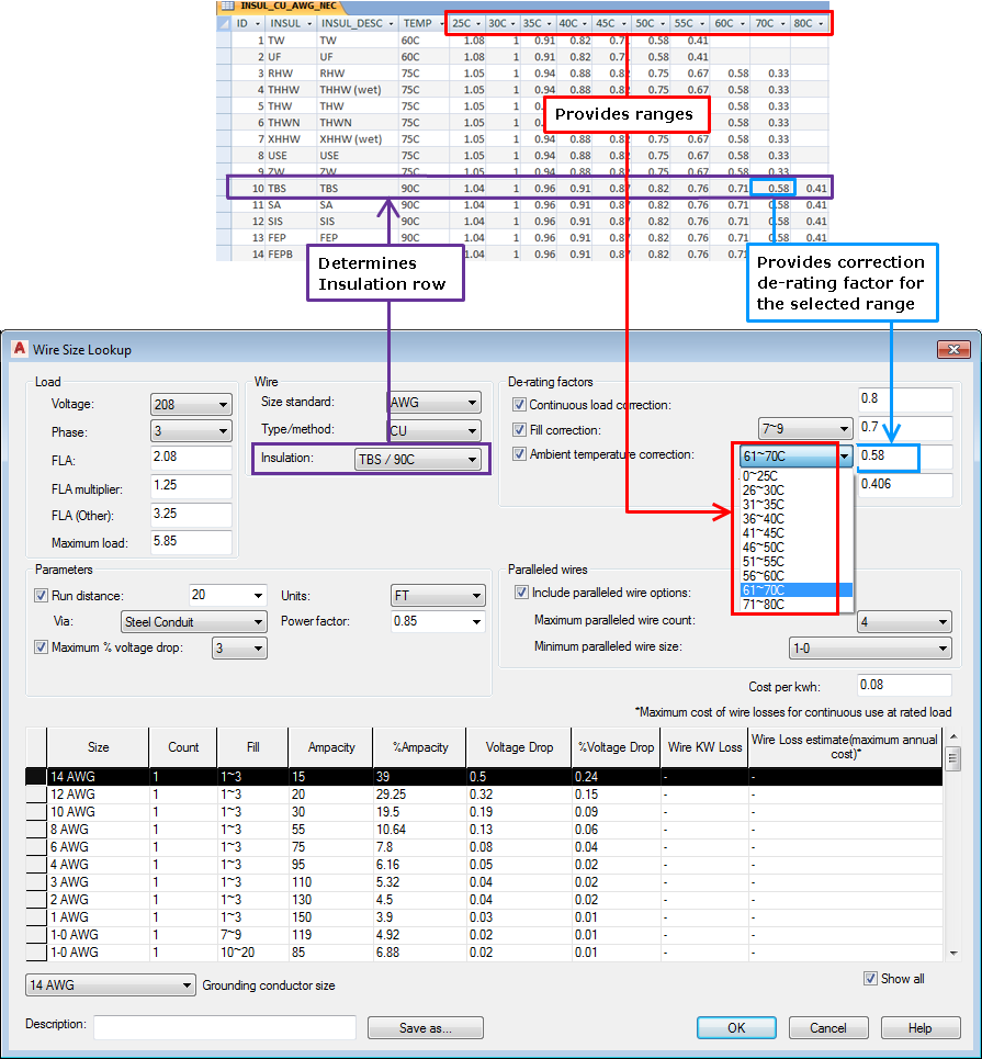 Maximum ampacity rating values for the wire conductor size for each of these standard ambient temperature ratings. Additional columns can be added or an existing column can be deleted. For example, if local electrical codes do not support 90C, this field can be removed from the table and does not show up as an option in the Wire Size Lookup dialog box.