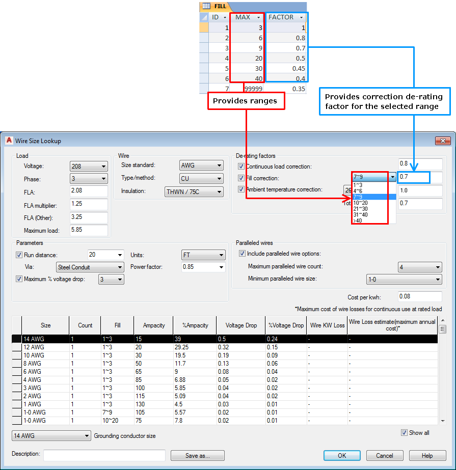 When multiple current carrying wire conductors are in the same conduit, duct, or raceway, the wire ampacity may need to be de-rated. Current carrying wire conductors are defined as power wiring, not ground, neutral, or control wires. The Fill table provides the de-rating factor based on the maximum number of power wire conductors.