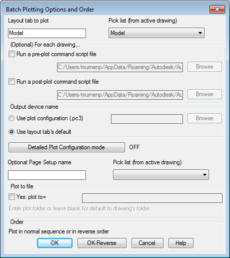 Make sure to select which layout you want to plot for the selected drawings. If you have a page setup defined, enter the name.