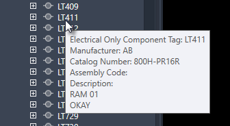 The various device types are represented differently in the component tree. When inserting electrical components, it is recommended that you should have unique names (installation code, location code, and component tag), pins, and terminals numbers. For example, if you have cable markers in your drawing, which has duplicate values for cable tag, then you may experience unexpected behaviour of the component in the component tree view and in the connections tab. This is more commonly observed for terminals and cable markers in Location View.