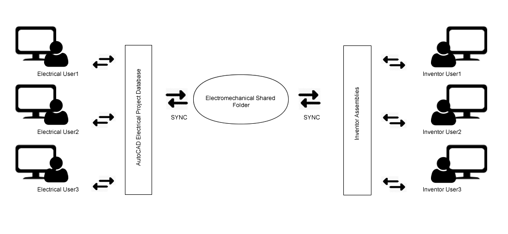 Electromechanical project manages and maintains data integrity between AutoCAD Electrical toolset and Inventor projects through synchronization. Synchronization, in electromechanical project, uses a push and pull approach during the process of data exchange. In case of AutoCAD Electrical toolset users; the Inventor data is first pulled in and your component tree view is updated, and then AutoCAD Electrical toolset data is pushed out to Inventor. Synchronization fails when you are disconnected from the network and the connection to the link file is broken—you can continue to work offline on your drawing files and use the location view tab to manage the components. You can synchronize your offline work after you have re-established the connection to the link file in the network.