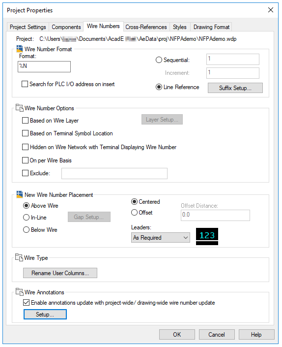 - Enable or disable wire number annotation updates during project-wide or drawing-wide wire number updates for panel footprints and terminal block representations, including graphical terminal strips, tabular terminal strips, and jumper charts.