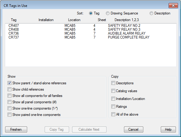 Sorts the list by component tag, drawing sequence, or description.