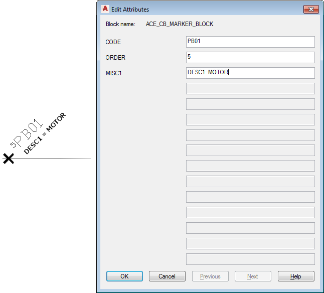 In AutoCAD Electrical toolset, find the marker block that defines the insertion point for the motor symbol. Find the CODE attribute value, for example MTR03.