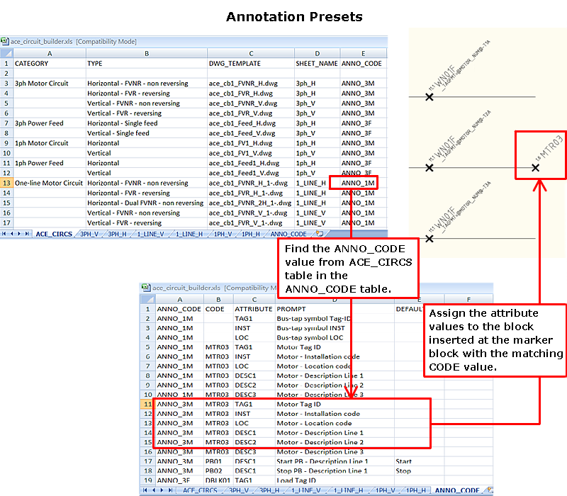 This sheet provides a link between the circuit you select (identified by the ANNO_CODE value), a specific marker block (identified by its CODE value), and a specific attribute on the marker block.