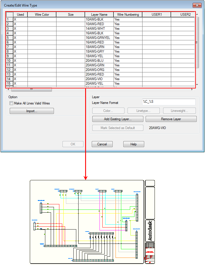 Use the Create/Edit Wire Type tool to create new or edit existing wire types or use the Change/Convert Wire Type tool to convert lines to wires. The wire layer name and the associated wire properties (such as wire color, size, and whether the wire layer is processed for wire numbers) are saved in the drawing file. The following rules determine the wire layer for a new wire: