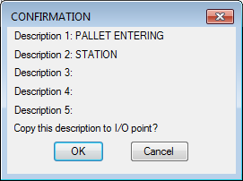 This dialog box provides spaces for you to enter description text for each I/O point. Assume that the descriptions already assigned to the connected limit switches are like what you want to use for the PLC I/O point descriptions.