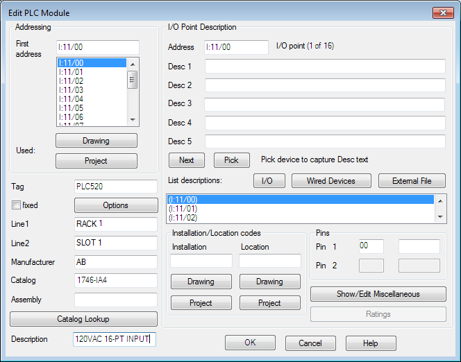 Note: Alternately you can use Pick to capture existing description text from a connected device. To do so, in the Edit PLC Module dialog box, click Pick, and then select the component whose text you want to copy. AutoCAD Electrical toolset reads the existing DESC text values on the component and transfers a copy to the DESC boxes in the Edit PLC Module dialog box.