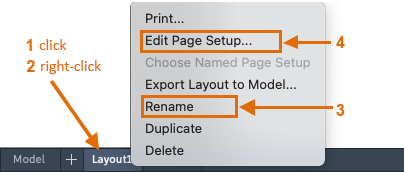 The first thing that you should do when you access a layout tab (1) is right-click the tab (2) and rename it (3) to something more specific than Layout 1. Names that reference a specific ANSI or ISO size might be a good choice.