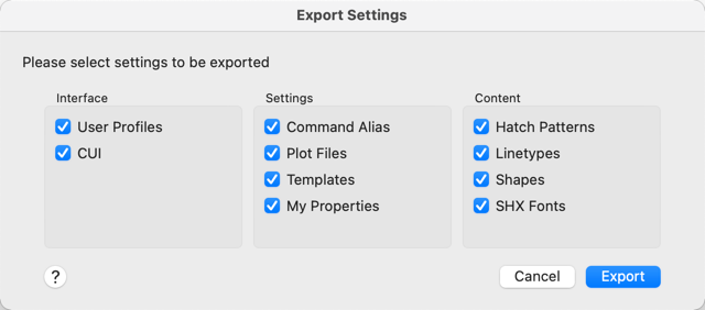 Exports custom user settings for import on another machine. Settings can include user profile, toolbar and toolset customizations, command aliases, plot settings, templates, and the My Properties settings for the Property palette.