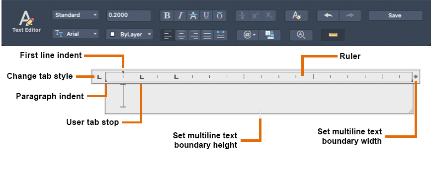 You can import or paste text from other files to use in multiline text, set tabs, adjust paragraph and line spacing and alignment, and create and modify columns.
