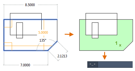 With the MEASUREGEOM and AREA commands, you can specify a series of points or select an object to find the enclosed area. While using the Quick mode in the MEASUREGEOM command, you can click within an enclosed area to display the calculated area and perimeter in the Command window. Perimeter calculations include those of enclosed interior islands.