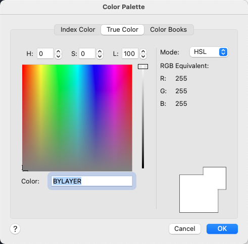 Specifies color settings using true colors (24-bit color) with either the Hue, Saturation, and Luminance (HSL) color model or the Red, Green, and Blue (RGB) color model. Over sixteen million colors are available when using true color functionality. The options available on the True Color tab are dependent on whether the HSL or RGB color model is specified.