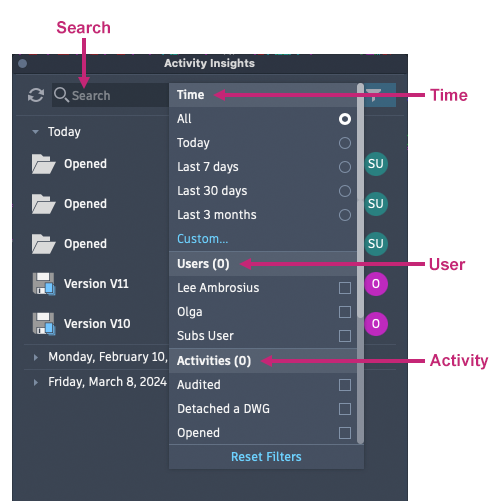 Note: You can select multiple options from the User and Activity filters.