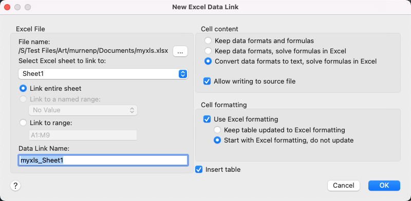 To Create a Data Link from an Excel File