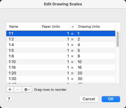 Displays the list of currently defined scales. Also displays temporary scales that are imported when xrefs are attached. If a scale name is duplicated, but has a different value, a number is appended to the name.
