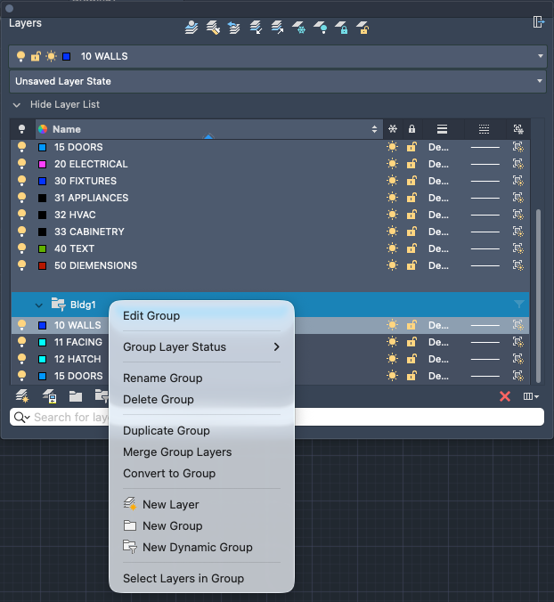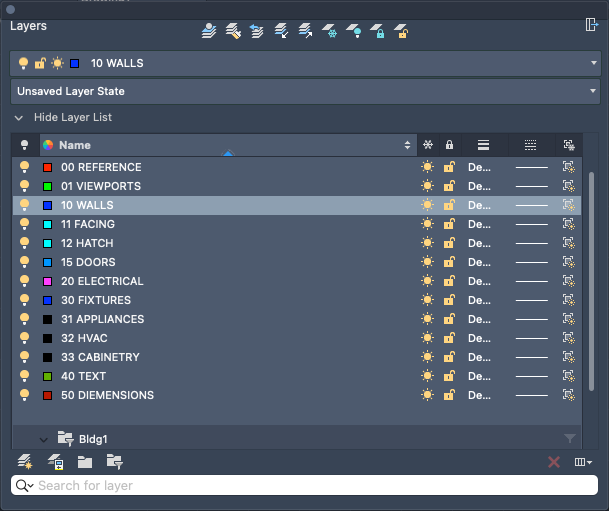 Displays a list of the layers in the drawing and their properties. You can add, delete, and rename layers, change their properties, and apply changes in realtime.