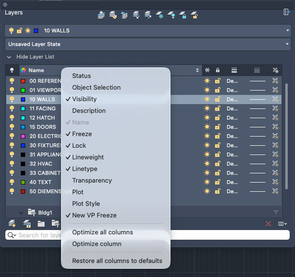 Lists all columns by name. A check mark indicates that the column is included in the display. Click a column name to display or hide the column. VP Freeze, VP Color, VP Linetype, VP Lineweight, and VP Plot Style are available only when a layout viewport is active.