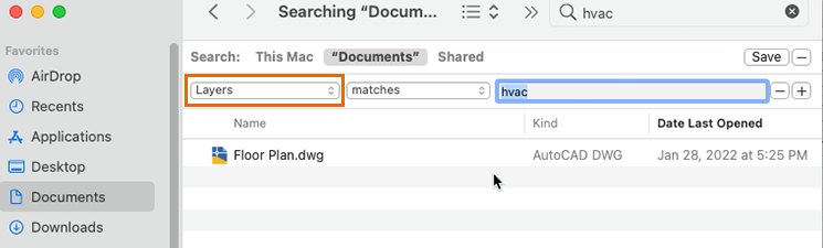 Note: The drawing must be saved using AutoCAD for Mac 2023 or later before it is searchable based on its contents.