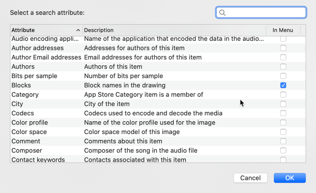 - Select the search attribute you want to search on, for example Blocks, Layers, or Layouts.