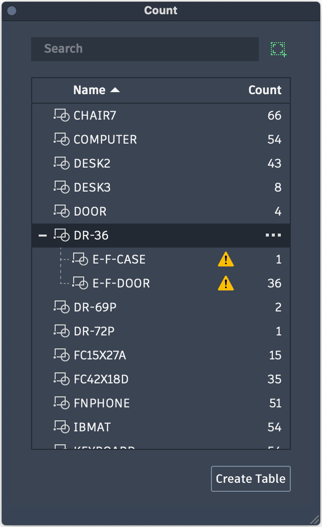 - Displays the block names and the corresponding count of each block found in the drawing. When multiple copies of a block are inserted in the drawing, and these copies have different properties, you can filter the count based on the general block properties such as the layer, scale, and mirror state. Additional filters are displayed for user-defined parameters and attributes of the counted blocks. Right-click to see filters.