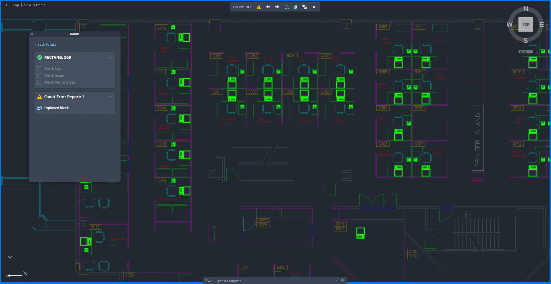 The Count palette displays the block names and the corresponding count of each block. When you are in an active count, the Count palette displays count details including the error report, if any. The report lists the count errors such as overlapping, exploded, or renamed objects.