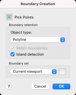 Defines the object type, boundary set, and island detection method for creating a region or polyline using a specified point within an area enclosed by objects.