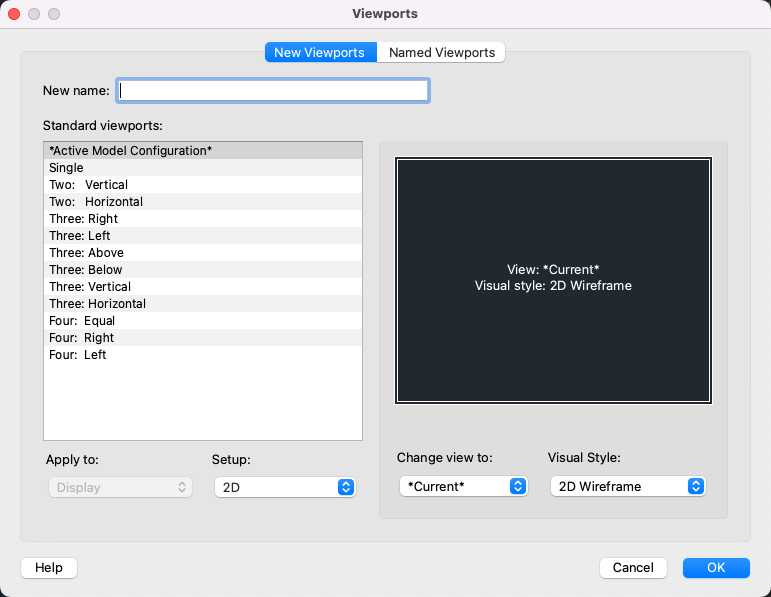 Specifies either a 2D or a 3D setup. When you select 2D, the new viewport configuration is initially created with the current view in all of the viewports. When you select 3D, a set of standard orthogonal 3D views is applied to the viewports in the configuration.