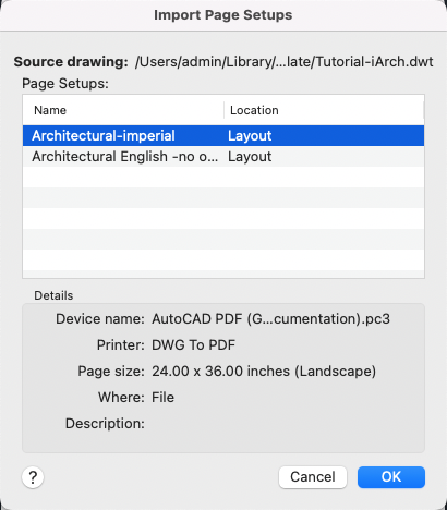 Lists the page setups that are available to import and their location in the source drawing. Selected page setups are imported into the current drawing when you click OK.